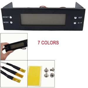 Net Weight: 108g; Package: 1 x PC Temperature Controller, 4 x Screws, 1 x Self-adhesive Sticker; Attractive blue backlight and 7 different color to change in screen; Acoustic notification when actual temperature becomes higher than user defined limit; Automatically regulated rotation speed of CPU when temperature gets too high; Suitable for all PC's with speed controllable fan with 3 pins socket; 4pin connector for power supply, 2 pin connector for Fan Control, and Connect the small 4pin with 4pin header on the LCD PCB; Fits in 5.25" drive for easy installation; Switch Function: RESET Switch: reset all function; MODE Switch: control switch for temperature of CPU/HDD/VGA; SET Switch: for time set up (hour/minute); C/F-UP Switch: time set up (number change)